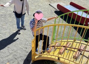 ぐるぐると遊具をまわり、「次はここ!」と到着したのは輪くぐり。年長さんの男の子が、「怖い…」となかなか行けず、